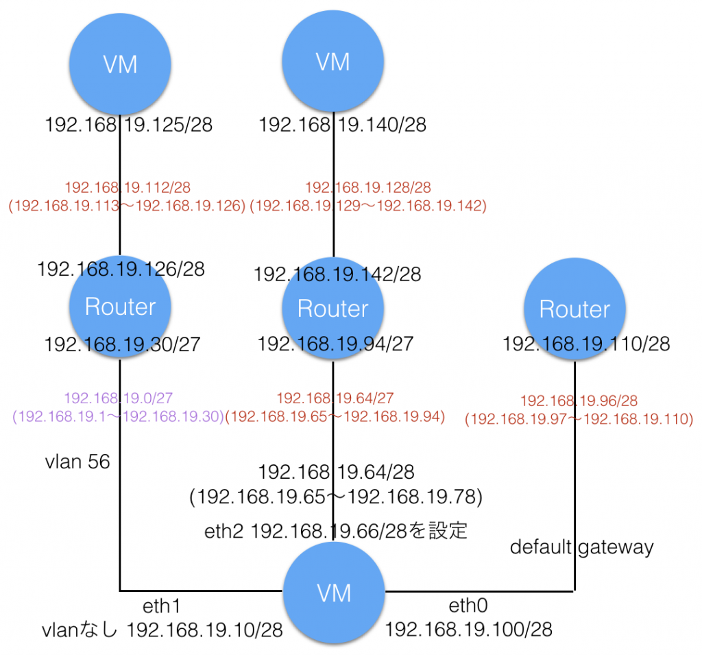 よってeth1、eth2ともにサブネットを/27にして、eth1ではパケットにvlanタグがついているのでeth1をvlan56のインターフェースにすることで解決する問題でした。