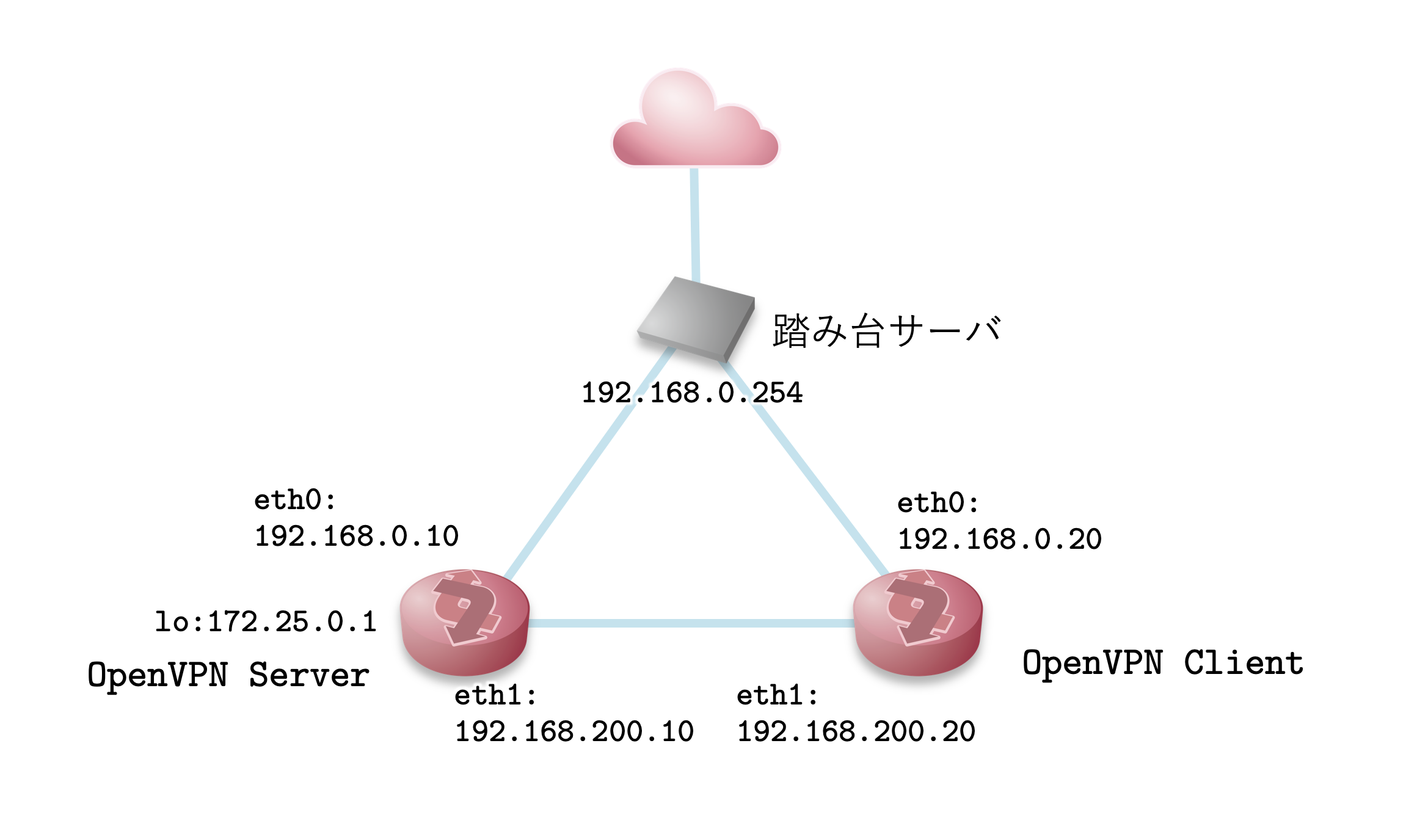 - OpenVPN Serverにはループバックインタフェース(172.25.0.1/32)があり、OpenVPN ClientはVPN越しにこのループバックのアドレスに通信ができること