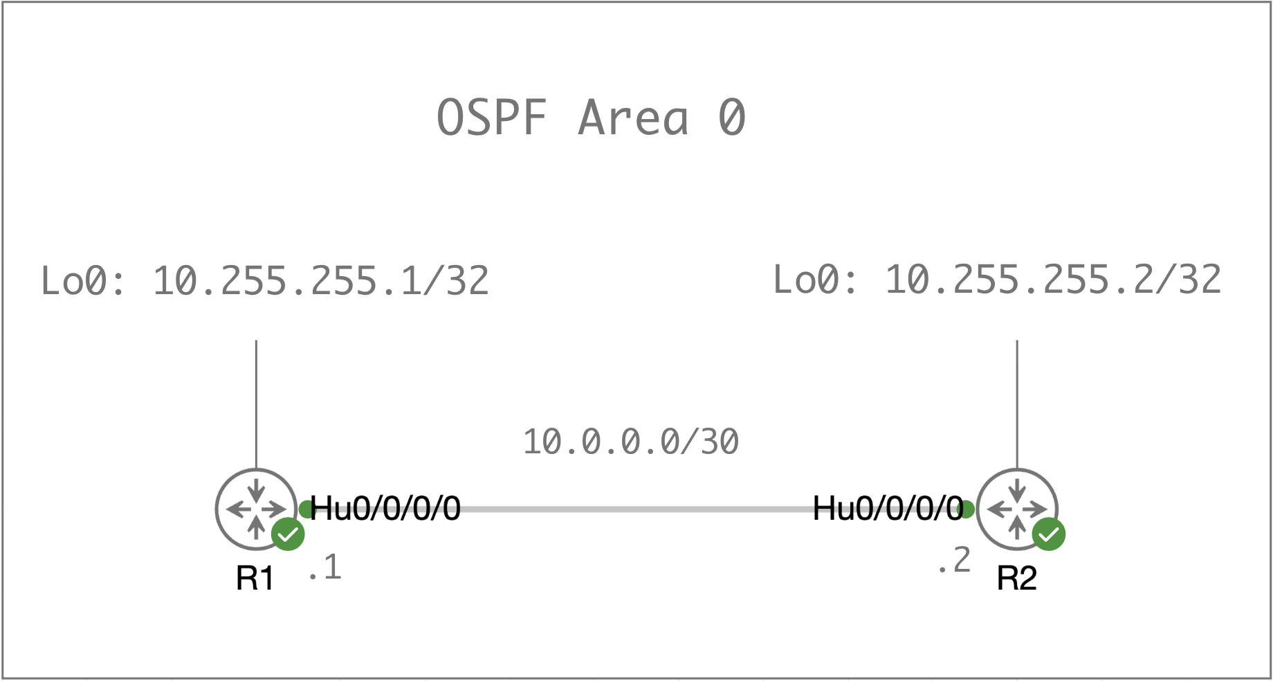 2台のルータ (R1 - R2) 間で OSPF neighbor が確立している。本リンクは OSPF のネットワークタイプが point-to-point(DR/BDR は使用しない)で動作している。また、router-id は自身のルータの Loopback 0 の IP アドレスを用いている。構成図は以下のとおりである。