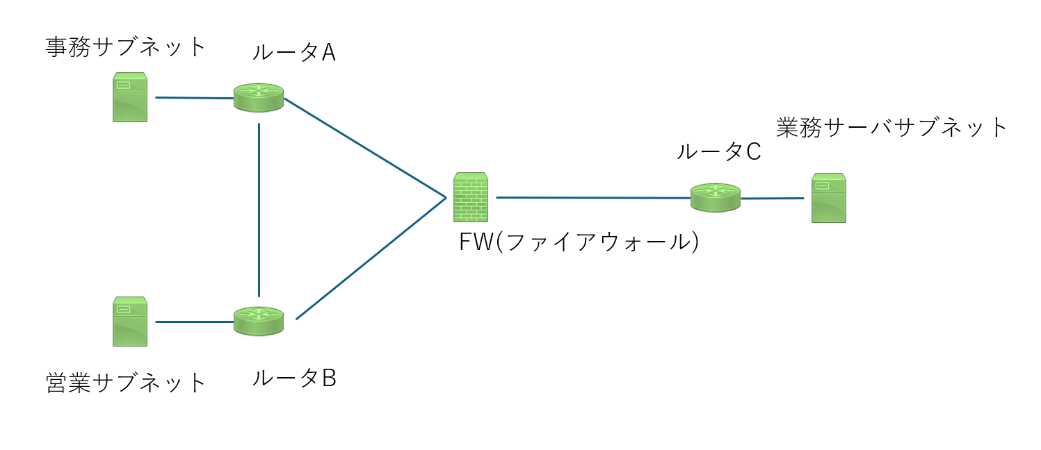 架空の会社であるA社では下記のように業務サーバサブネットへの通信については FW(ファイアウォール)を経由させることになっている。各ネットワーク機器は Juniper Network 社製のものを採用している。ルータA、B、Cはそれぞれ FW と直接つながっており、ルーティングには OSPF を用いている。また事務サブネットと営業サブネット間は FW を経由せずに通信が可能となっている。