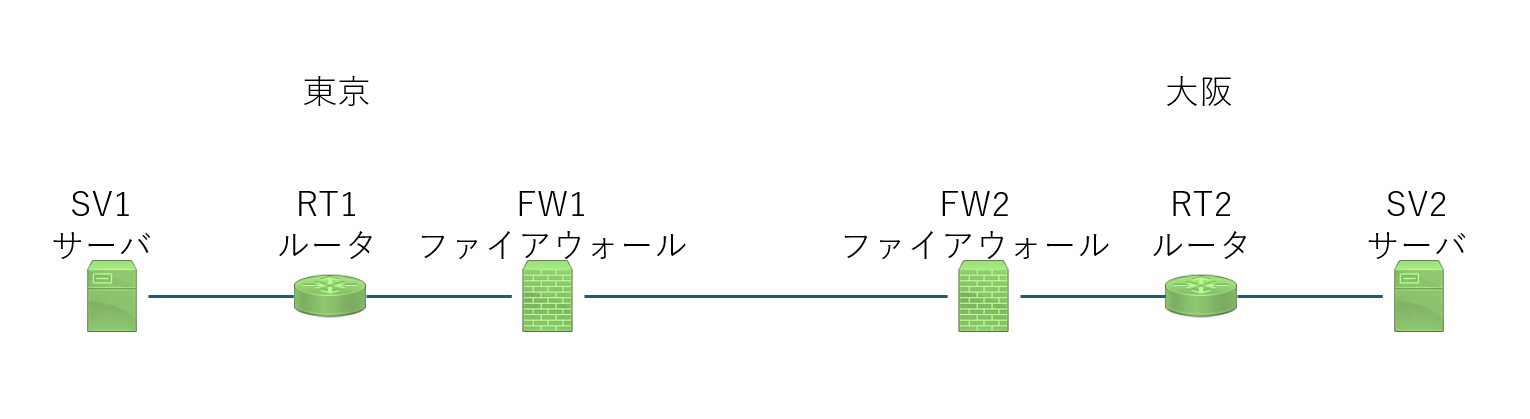 架空の会社であるA社では東京と大阪に事務所を構えており、アンダーレイとして IPv4、オーバーレイとして IPv4 と IPv6 を利用して接続を行っている。また、ファイアウォールである FW1 と FW2 間で IPsec VPN トンネルを利用しており、下図の通りの構成となっている。