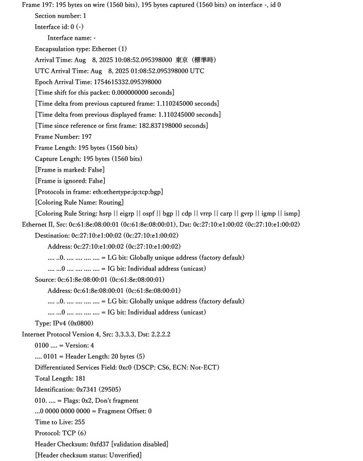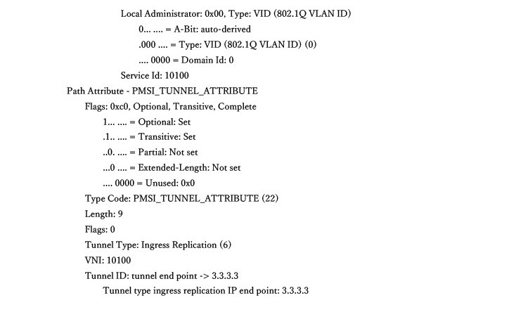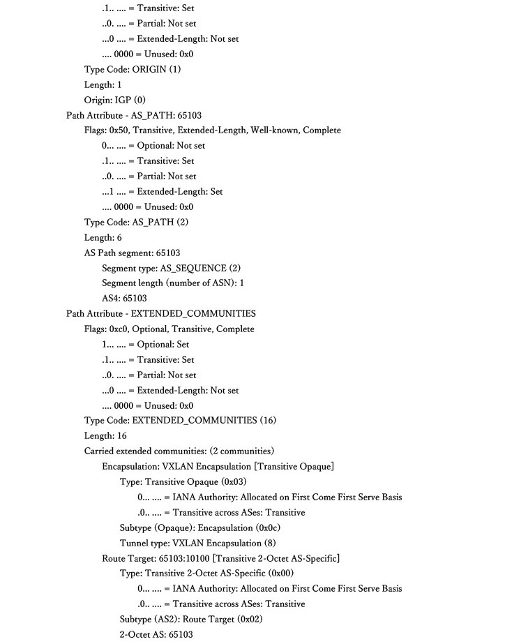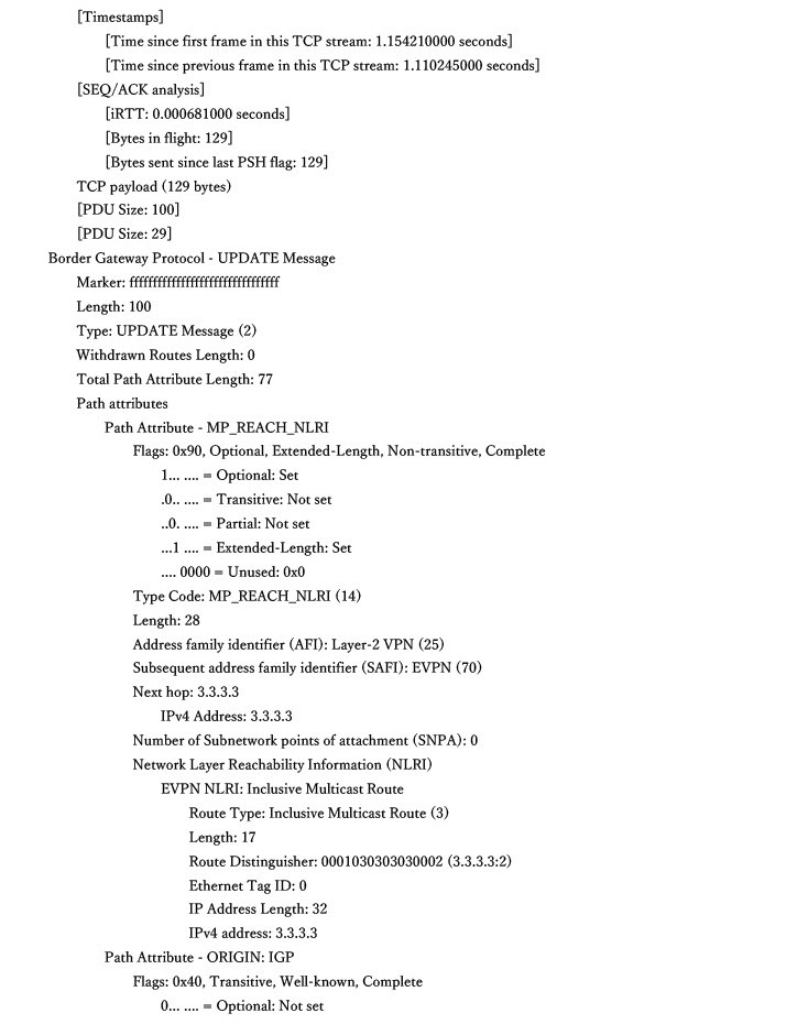 このパケットは L3 アンダーレイ上の L2 オーバーレイネットワークを構成する [A] に関連するパケットで、ネットワークに新たな [B] が参加した際に送付される BGP の UPDATE Message である。このパケットによって、ネットワーク全体は [C] トラフィックを転送すべき相手を知ることができ、[C] トラフィックを [D] キャスト通信に変換したうえで、[E] して送付することが出来る。[E] する方式は [F] と呼ばれており、その他に [G] キャスト通信を使った方式が存在している。