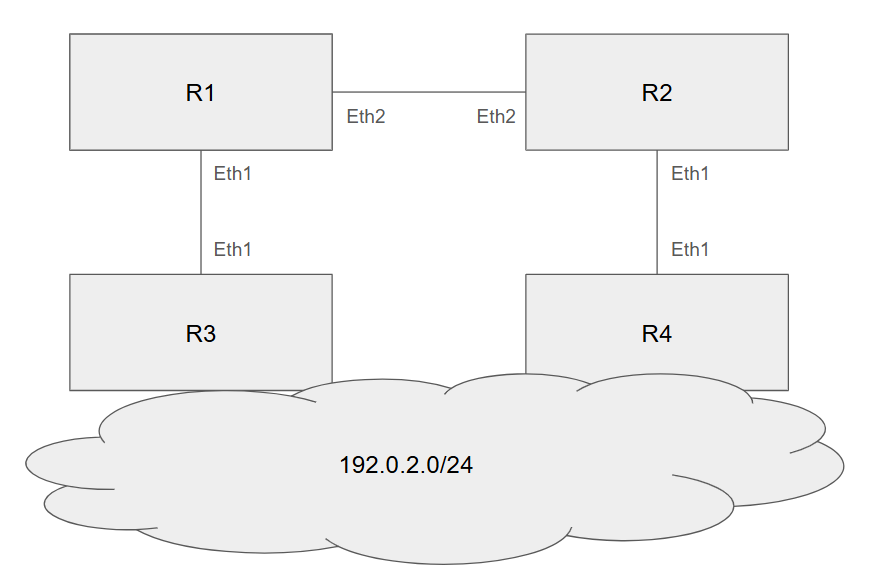 R3 と R4 は 192.0.2.0/24 のネットワークへの到達性を有することを模擬するために Lo アドレスに当該ネットワークのアドレスを持たせている。